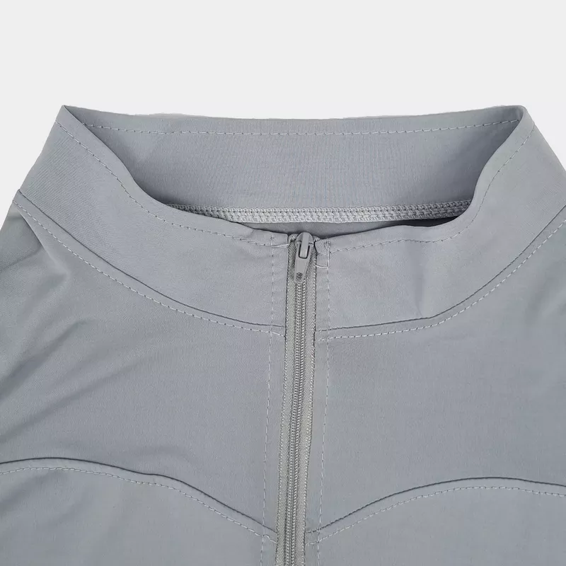 یقه ایستاده و زیپ سراسری، علاوه بر راحتی در پوشیدن، ظاهر اسپرت و جذابی به آن بخشیده است. وجود درزهای دوختهشده با طراحی خاص باعث فرمدهی بهتر و ایستایی زیبا روی بدن میشود. همچنین آستینهای بلند با محل عبور انگشت شست (thumb hole) از جابجایی آستین جلوگیری کرده و پوشش کاملتری در تمرینات ورزشی فراهم میکند.
